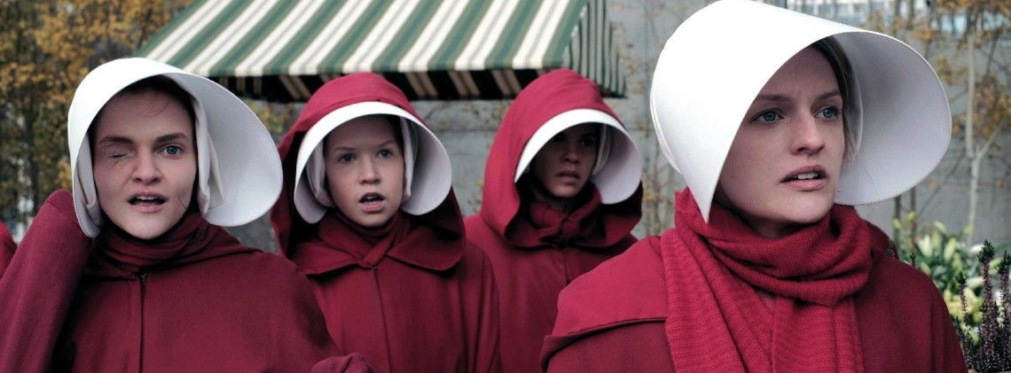 Elisabeth Moss (au premier plan) incarne Defred dans la série The Handmaid's Tale : La Servante écarlate. Les Servantes n'ont pas de prénom : elles portent celui de leur maître provisoire, précédé de « de ».
