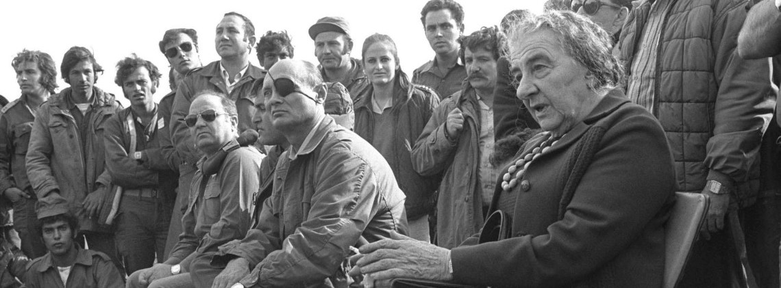 Guerre du Kippour, octobre 1973. La Première ministre israélienne, Golda Meir, et son ministre de la Défense, Moshe Dayan, rendent visite aux troupes sur le plateau du Golan.