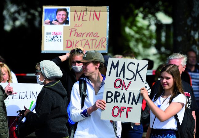 « Nous faire porter un masque pour nous décérébrer. » À Munich, en mai 2020, des manifestants protestent contre les mesures prises pour lutter contre la pandémie de Covid-19.